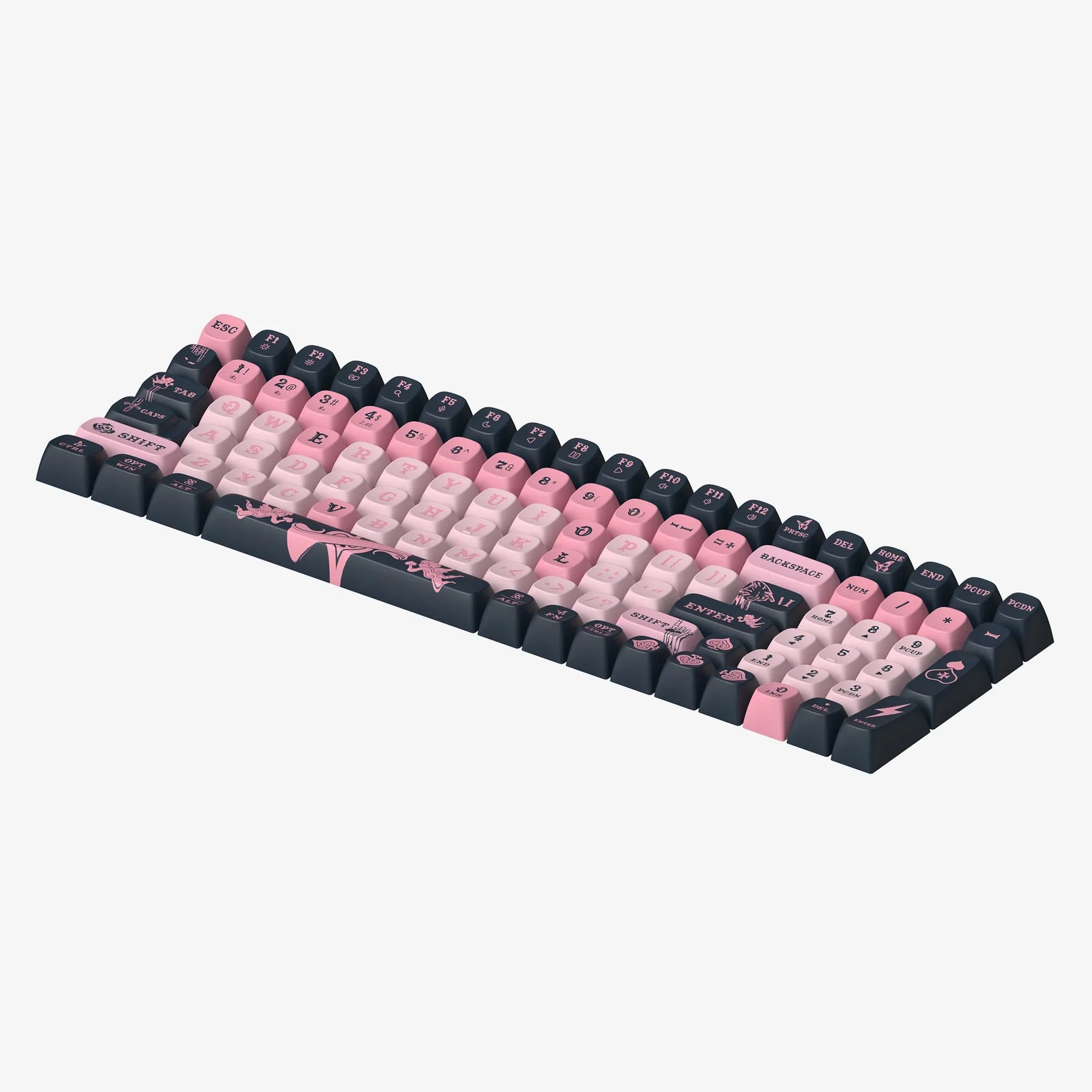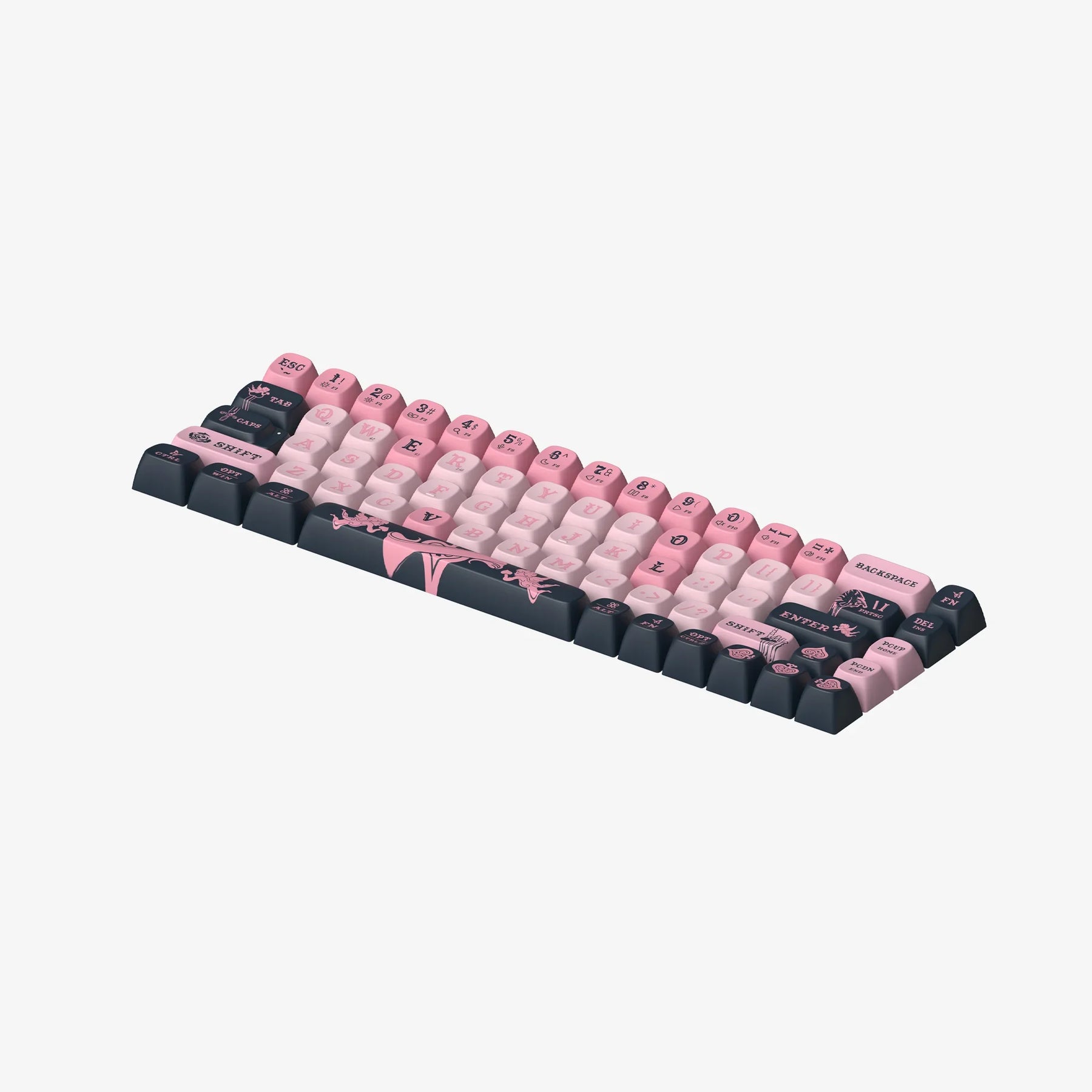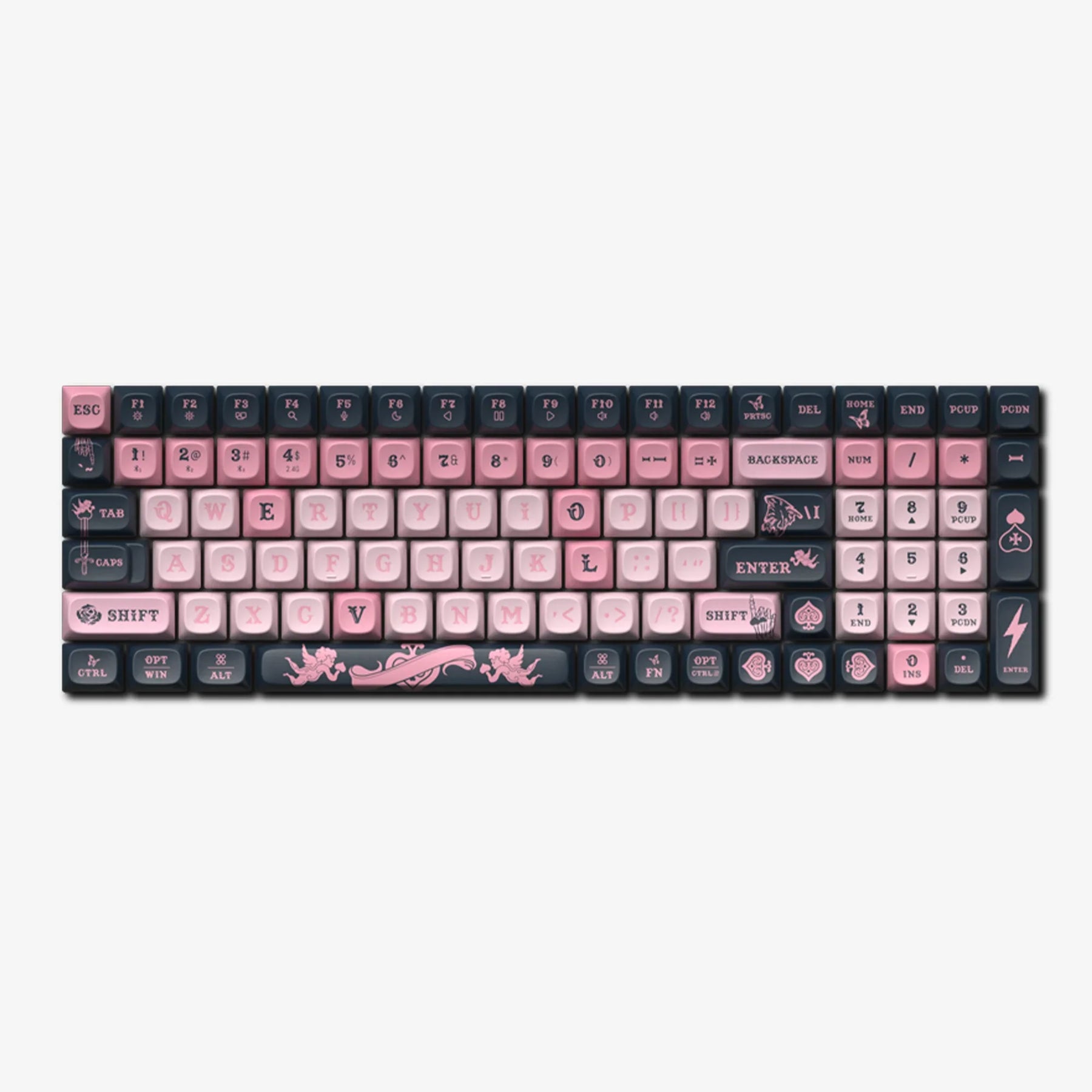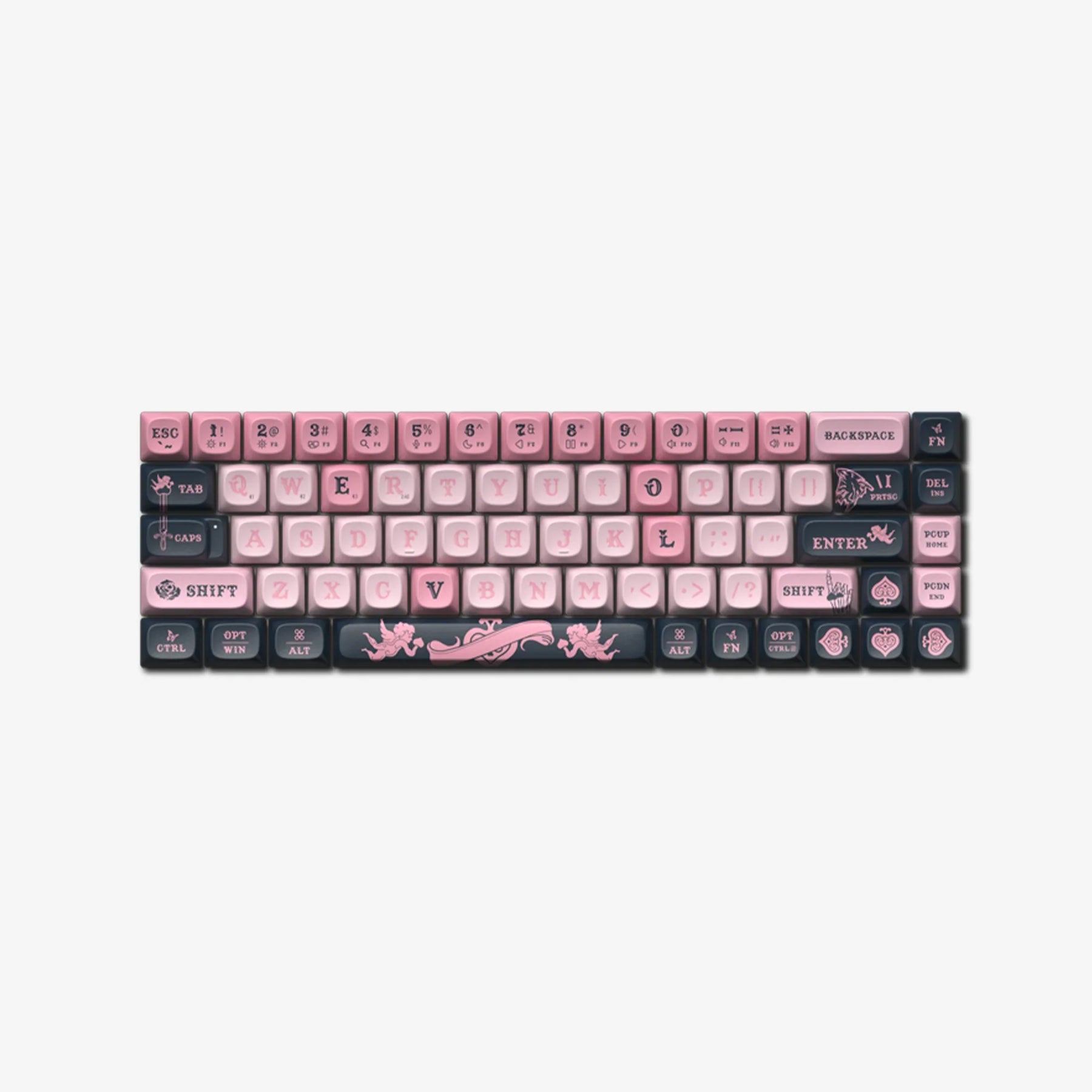 Infused with a black and pink hue that symbolizes love, our Cupid's Touch Keycaps feature the charming elements of Cupid. Each key, especially "L," "O," "V," "E," with a deeper color, drawing you into the heart of romance. This design not only adds a touch of elegance to your keyboard but also serves as a constant reminder of the enduring beauty of love, inspiring every keystroke with a whisper of affection.