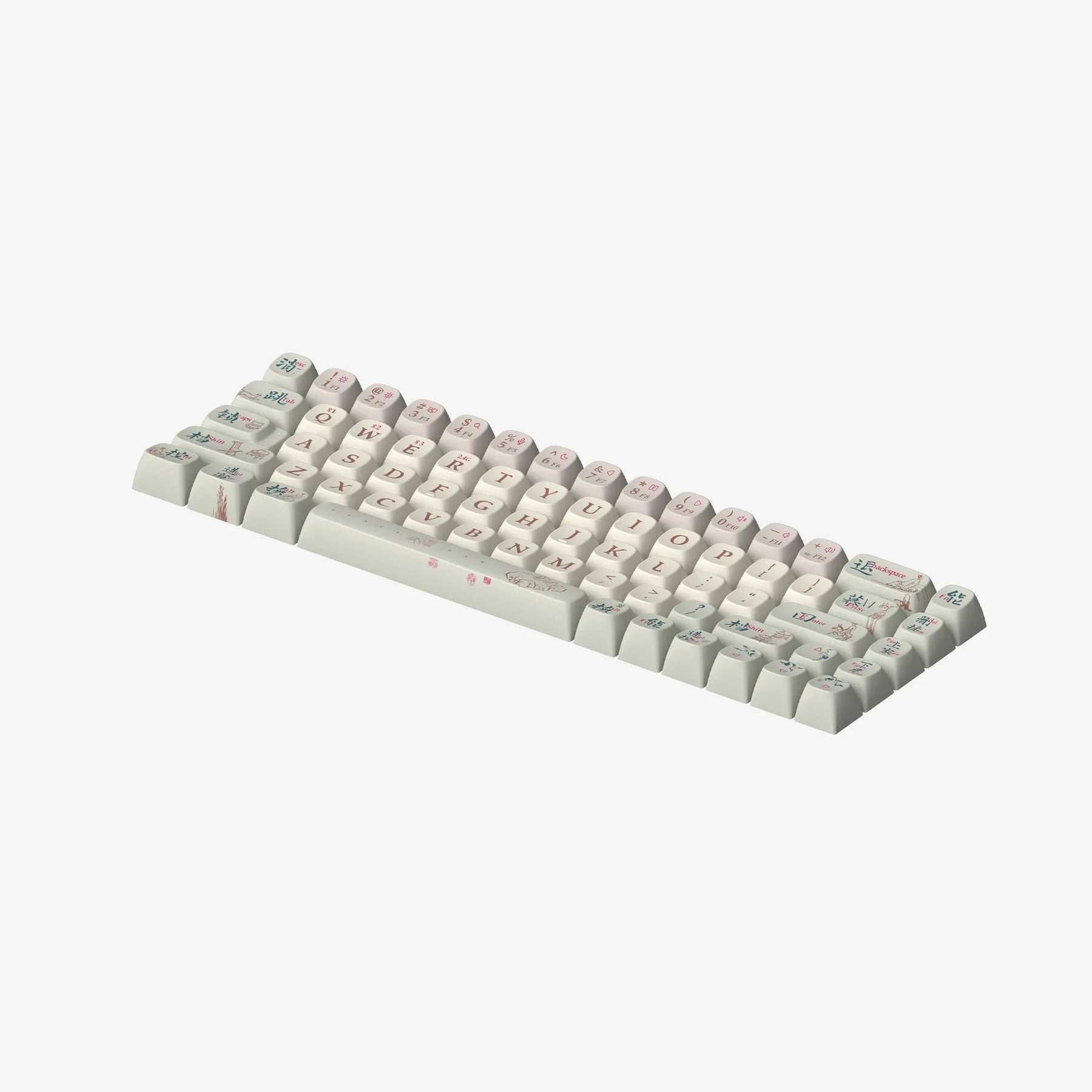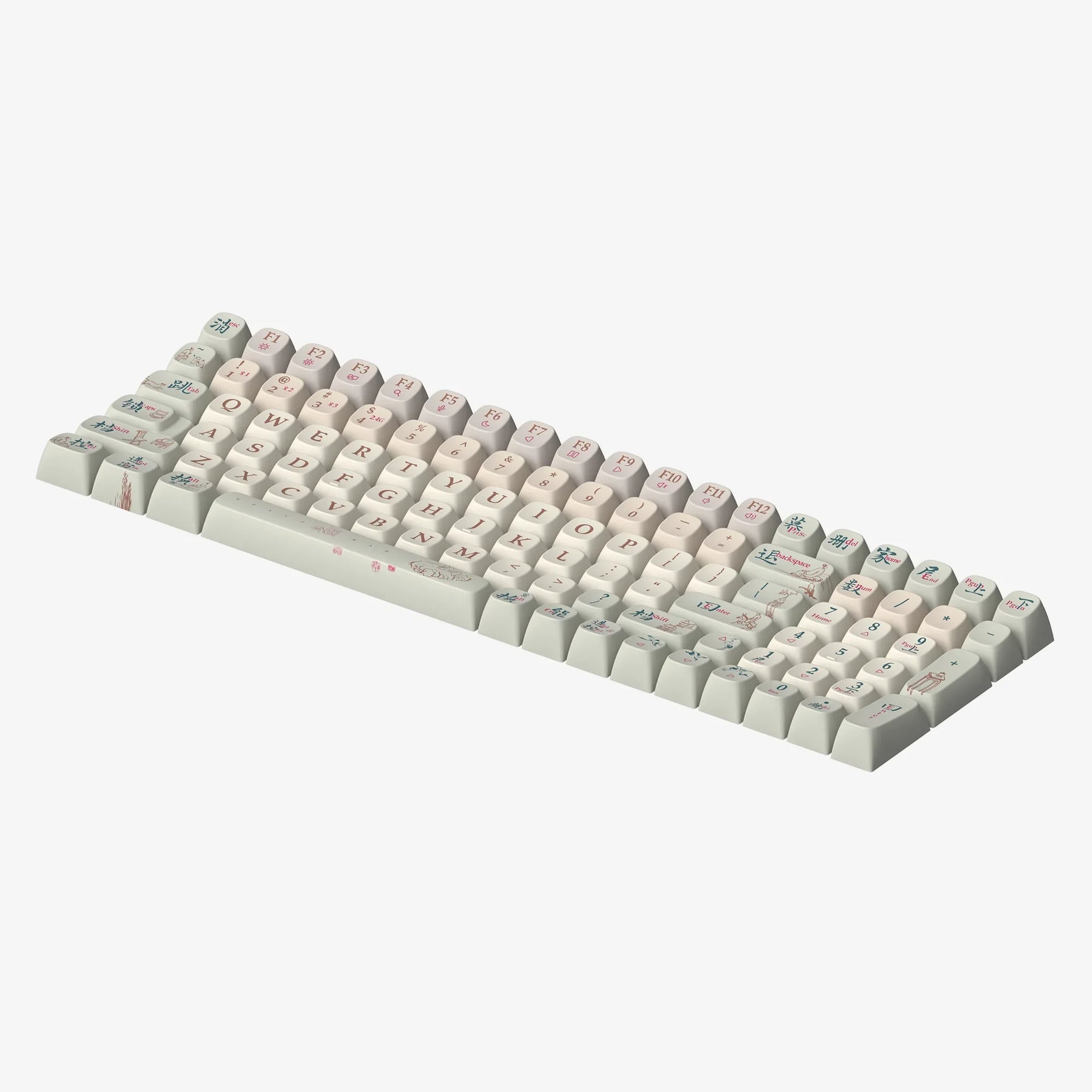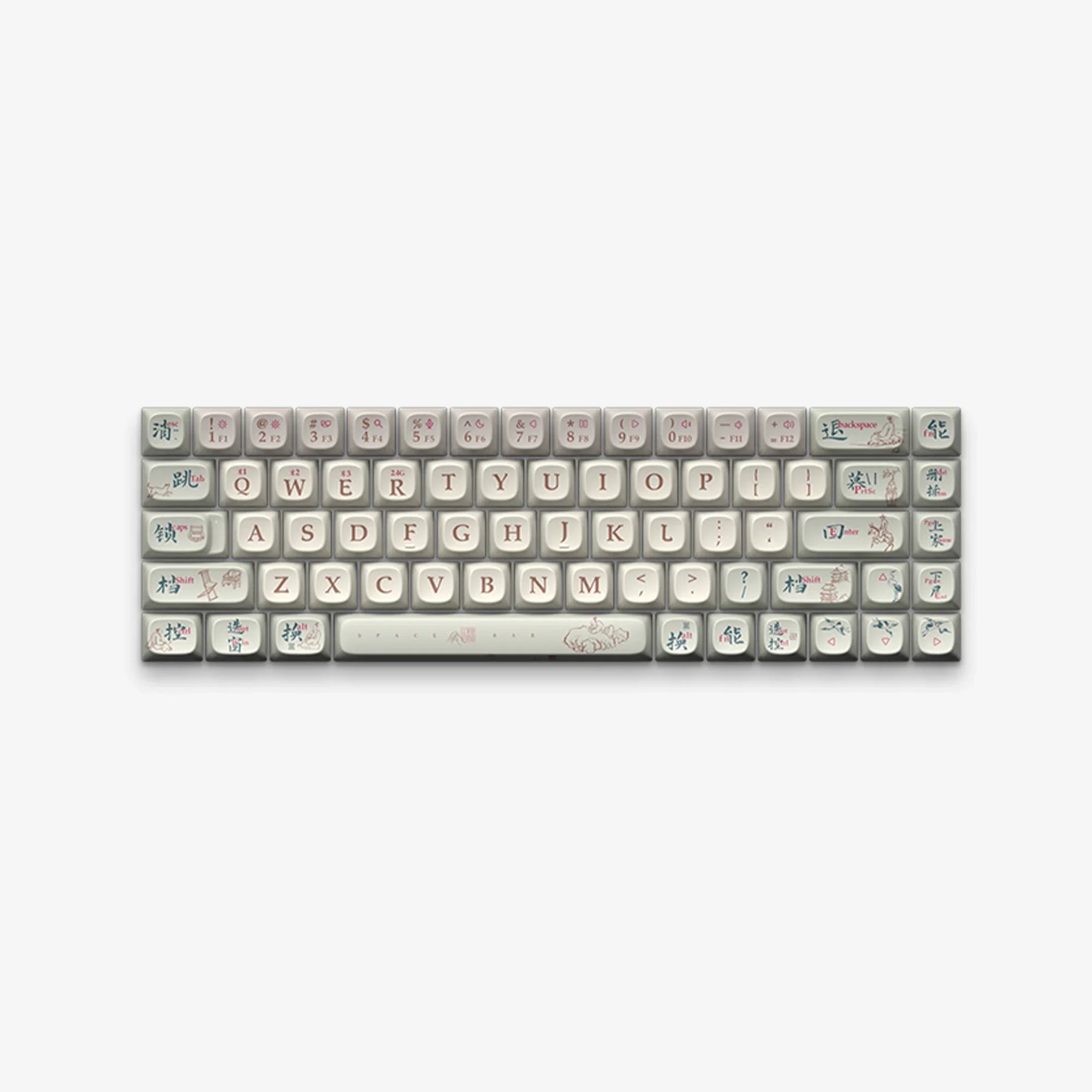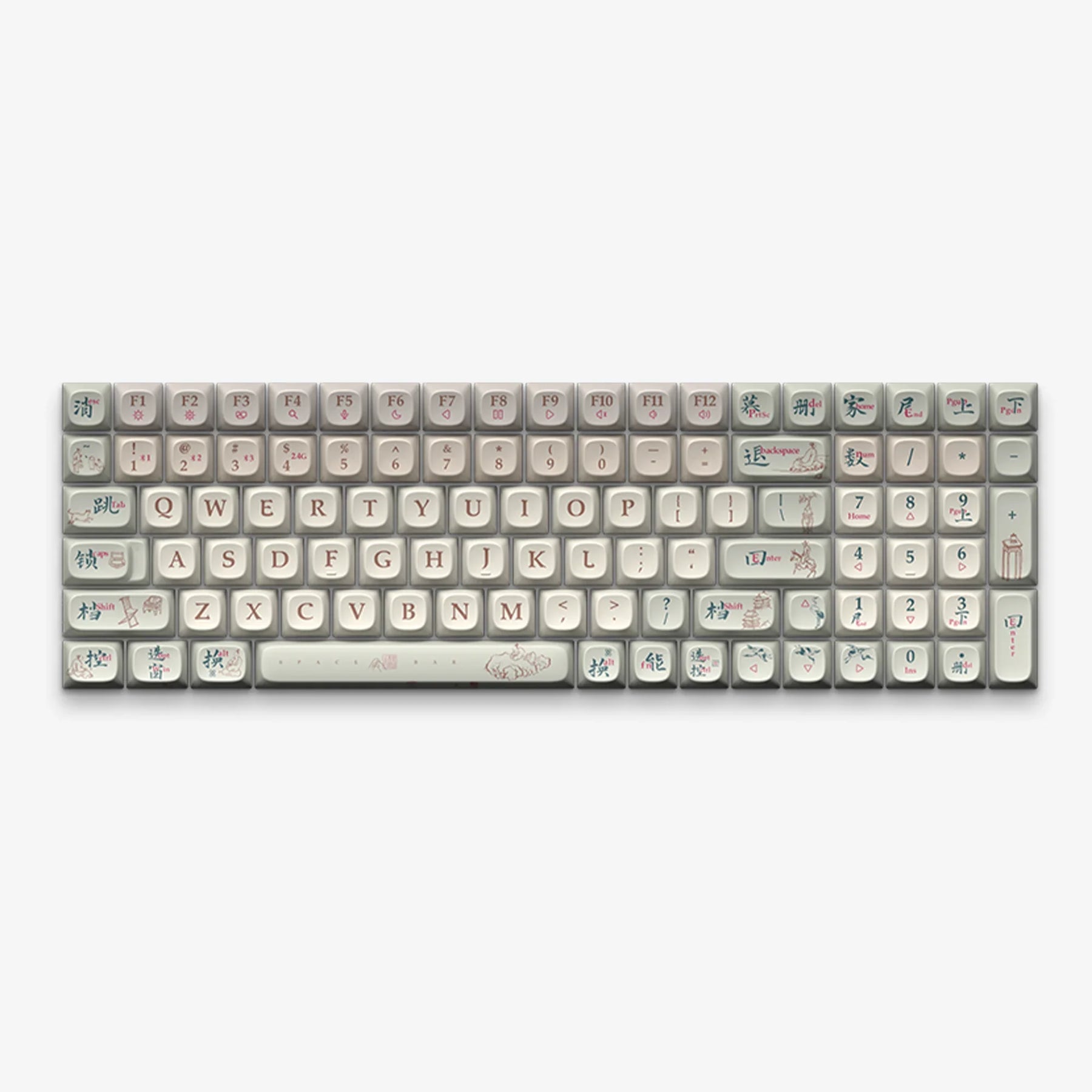 Inspired by the refined painting styles of China's Song and Tang dynasties, our "Dynasty Designs" keycap set transforms your keyboard into a canvas of ancient artistry. System keys are marked with both English and Chinese translations, utilizing ancient Chinese typography to bridge past and present. Decorative elements typical of the period, such as poets, horses, traditional houses, rock gardens, and scenes of activity, are intricately integrated to illustrate the function of each key. This set offers not just a way to type but an opportunity to engage with Chinese cultural heritage every day.